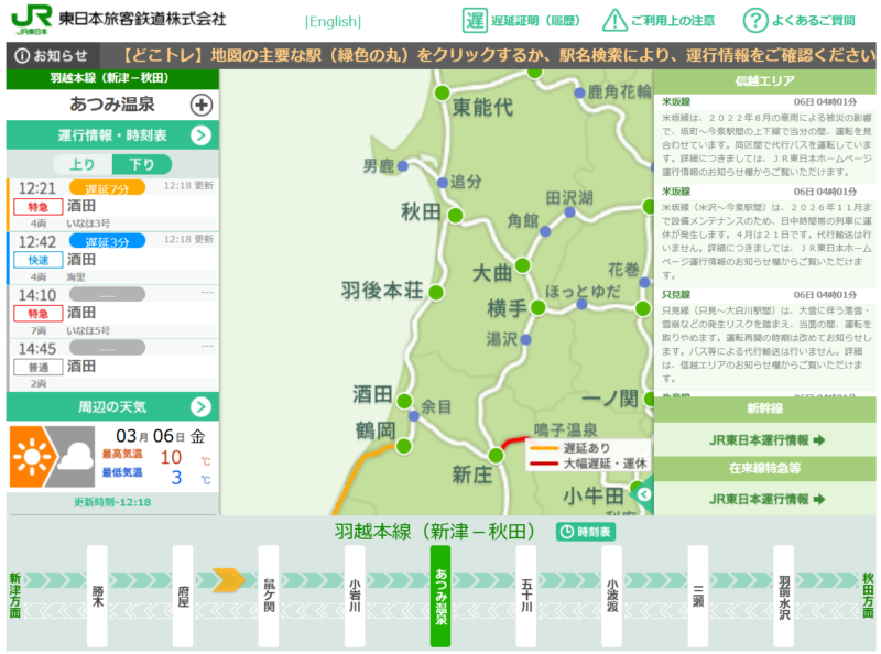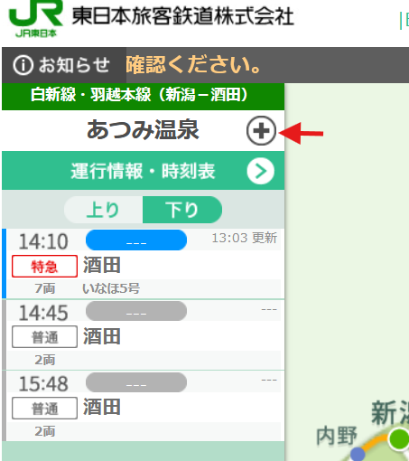 情報を得たい駅が、●印表示の駅でなければ、「🔍駅名検索」をクリックします。すると、検索ウィンドーが登場。一例として、ここでは羽越本線の「あつみ温泉」を検索してみます。