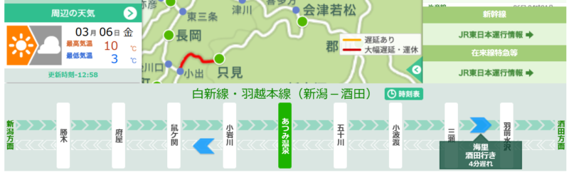 路線の運行状況を示した部分にカーソルを合わせてドラッグして左右に動かすと、もっと遠い駅の情報が簡単に見られます。この画像では右の方へとスクロールすることによって「勝木駅」よりさらに新潟寄りの駅を4つ先まで表示できています。